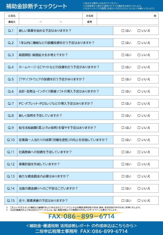 簡単なチェックシートにご回答いただくだけで、補助金・優遇税制の活用診断レポートを作成することができます。