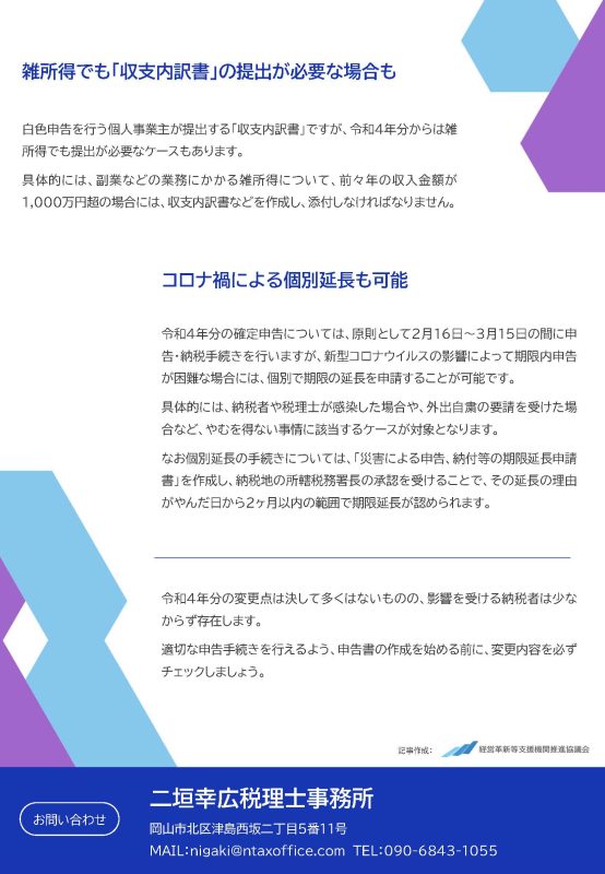 令和4年分の確定申告では大幅な変更点は少ないものの、一部の該当者には注意が必要な変更内容も含まれるため、しっかりとチェックしましょう。