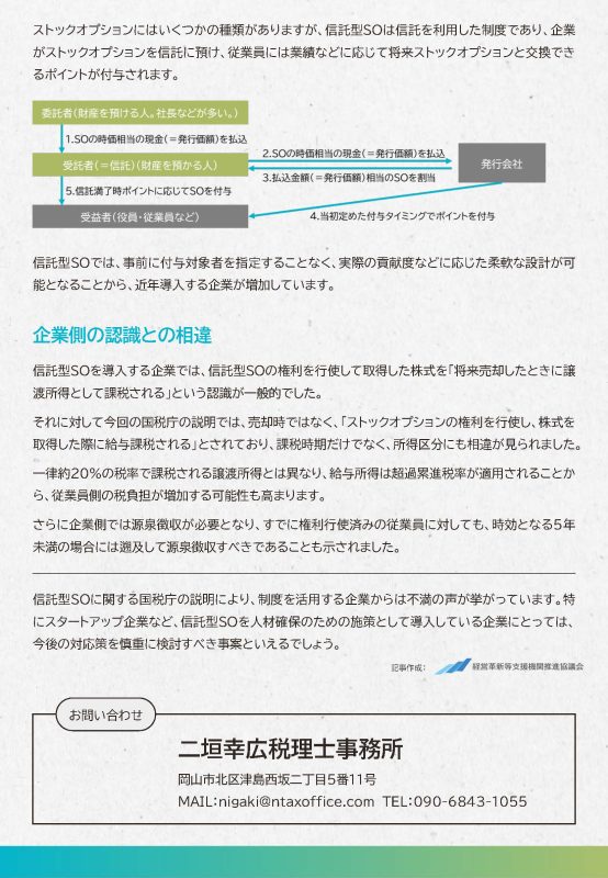 信託型SOに関する国税庁の説明により、制度を活用する企業からは不満の声が挙がっています。