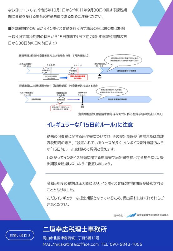 適格請求書発行事業者となるための登録申請や、発行事業者を取りやめる場合の届出については提出期限が緩和されます。