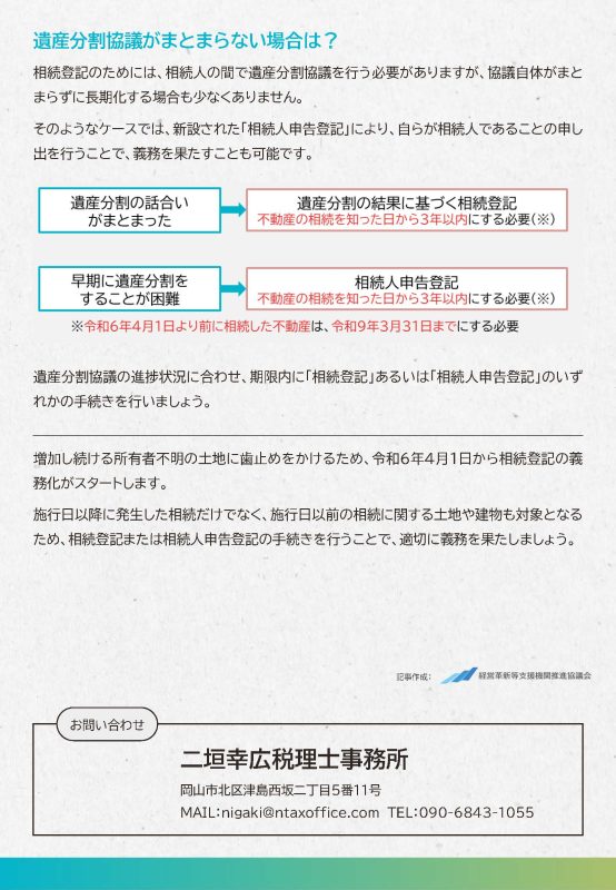 そのようなケースでは、新設された「相続人申告登記」により、自らが相続人であることの申し出を行うことで、義務を果たすことも可能です。