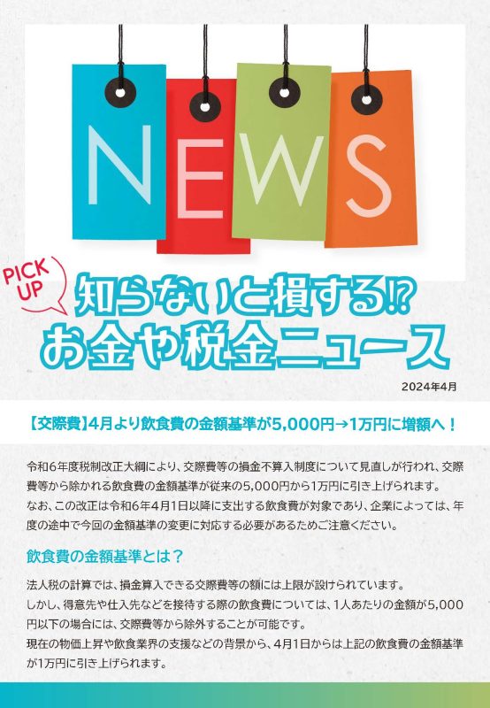 令和6年度税制改正大綱により、交際費等の損金不算入制度について見直しが行われ、交際費等から除かれる飲食費の金額基準が従来の5,000円から1万円に引き上げられます。
