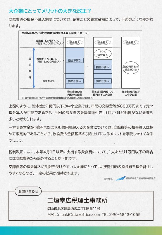 一方で資本金が1億円または100億円を超える大企業については、交際費等の損金算入は極めて限定的であることから、飲食費の金額基準の引き上げによるメリットを享受しやすくなるでしょう。