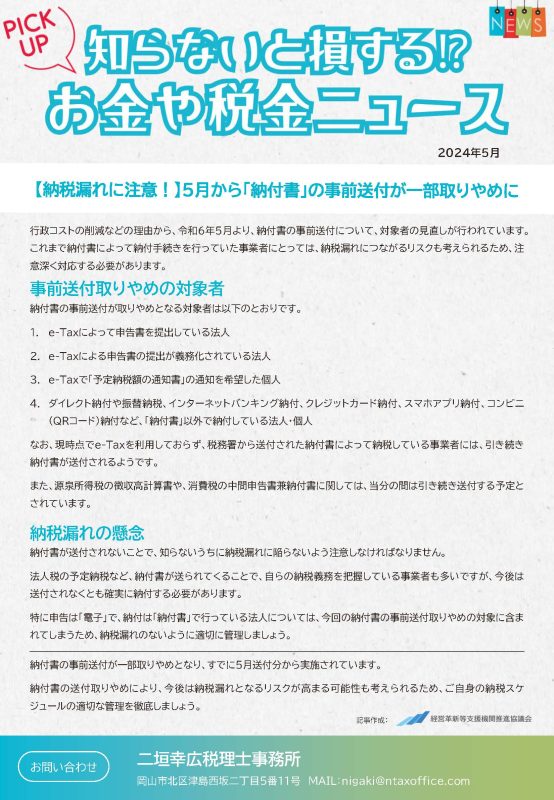 今回のテーマは、『納税漏れに注意!5月から「納付書」の事前送付が一部取りやめに』です。