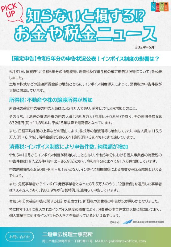 今回のテーマは、『<確定申告>令和5年分の申告状況公表!インボイス制度の影響は?』です。